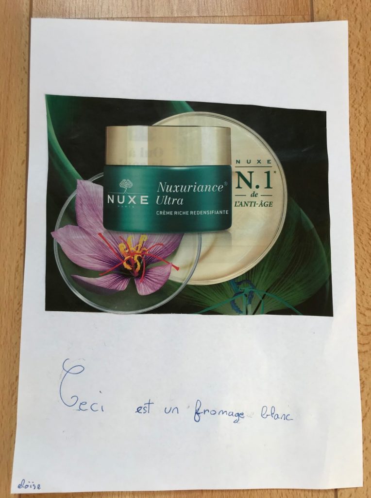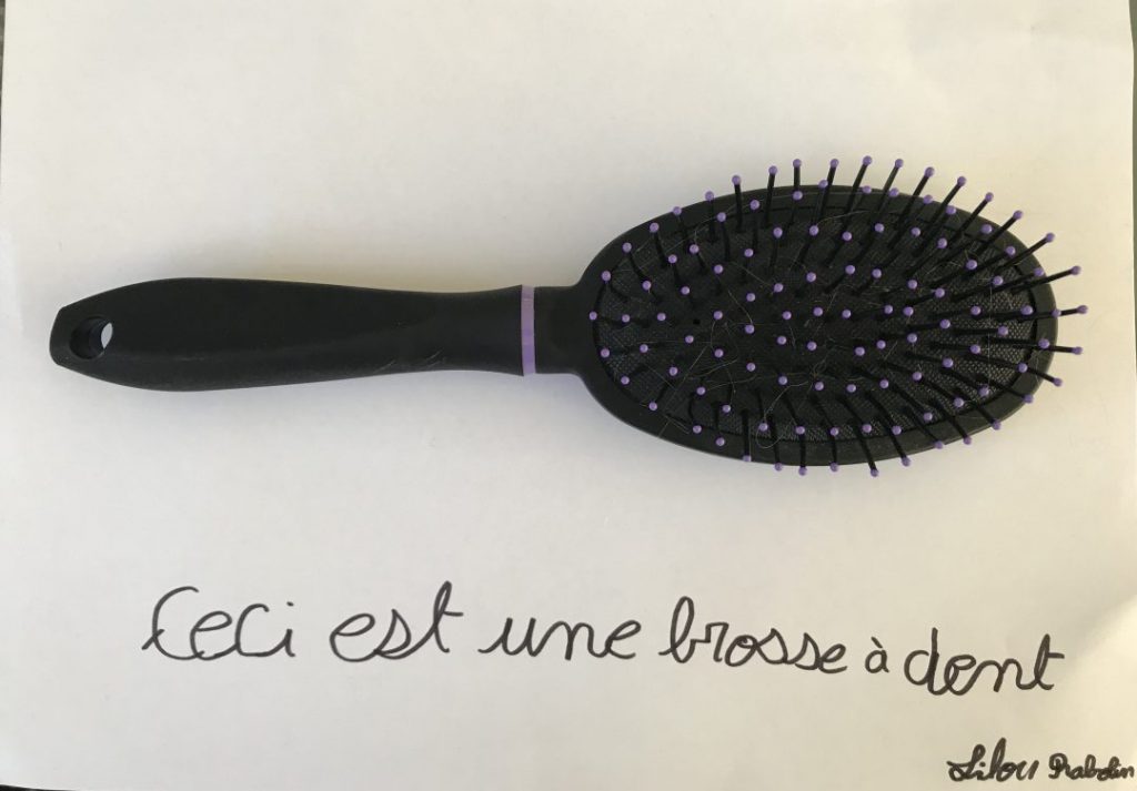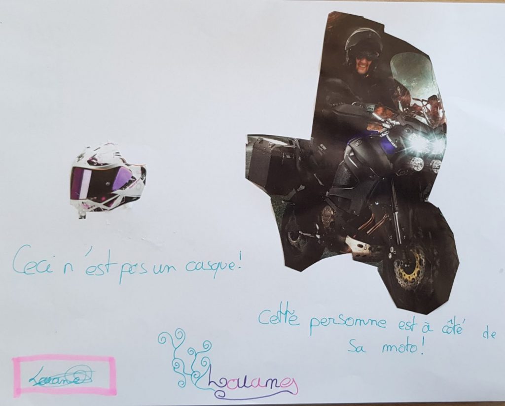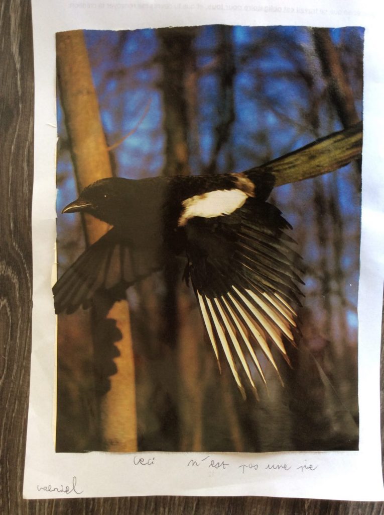 Ensuite, les élèves ont été invités à chercher une image qui leur plaisait dans un magazine, à la coller sur une feuille blanche puis à lui inventer un titre sur le modèle de ceux de Magritte. Ils pouvaient également utiliser un objet de chez eux pris en photo.