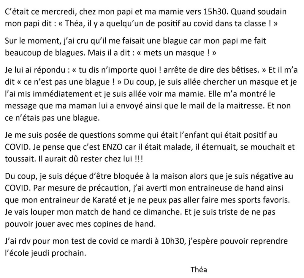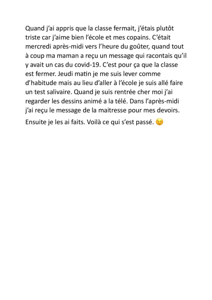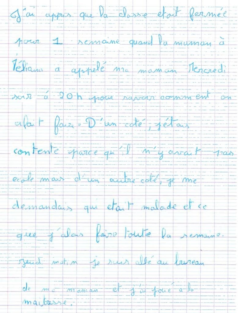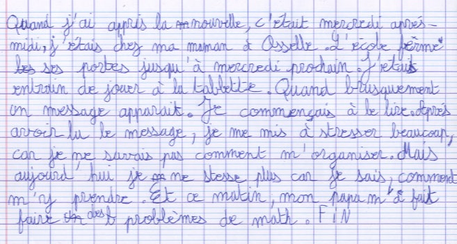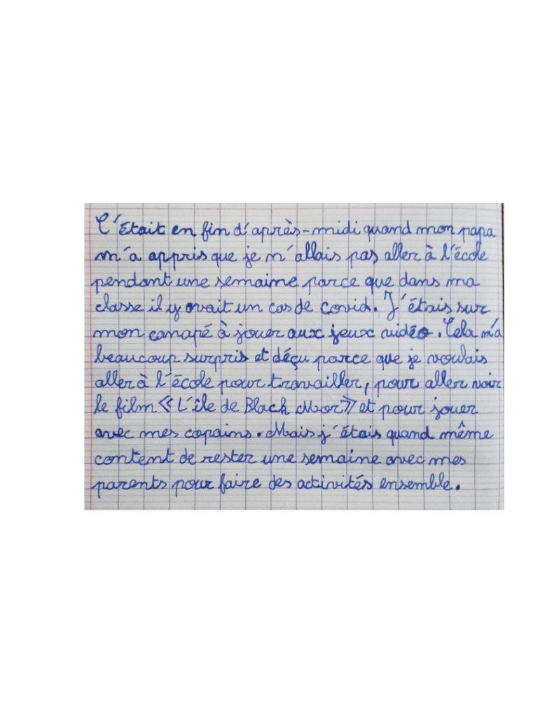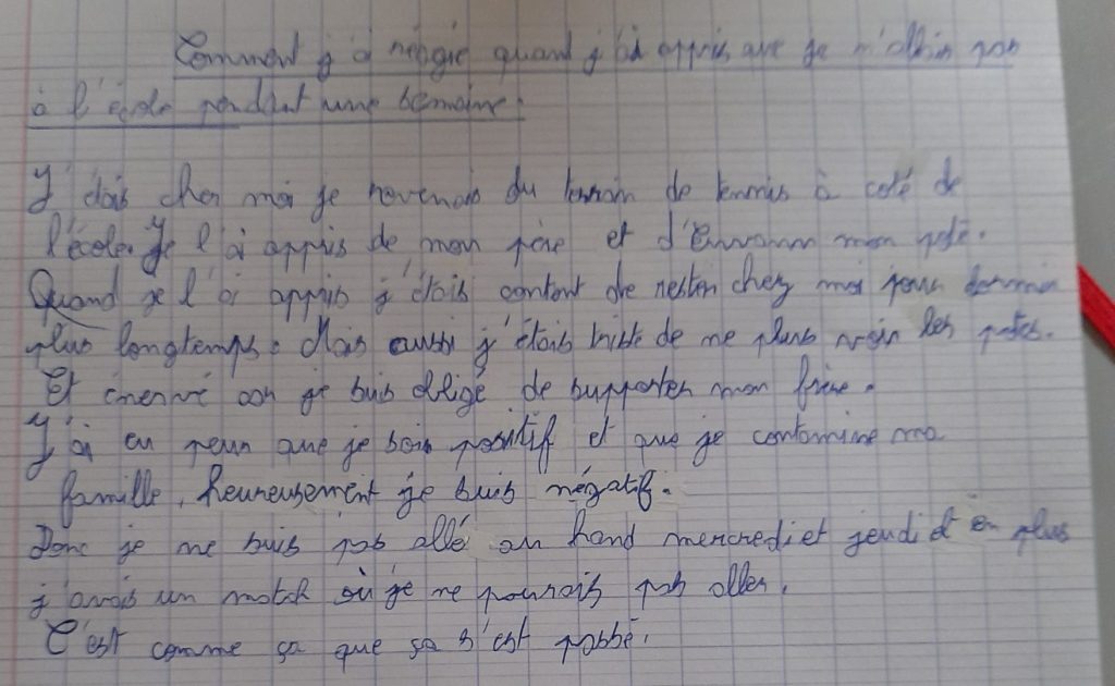 Écris un texte de 10 à 15 lignes dans lequel tu racontes comment tu as réagi lorsque tu as appris que tu n’allais pas pouvoir venir à l’école pendant une semaine.