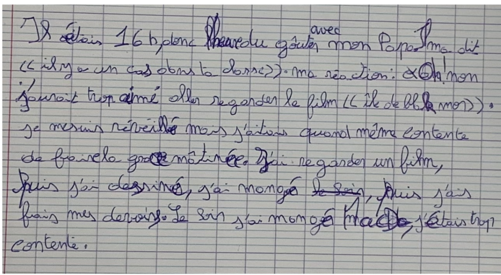 Quand tu auras écris ton texte, relis-toi plusieurs fois pour vérifier que tu n’as pas oublié de mots, que tu as fait des vraies phrases (une idée par phrase, majuscule et point), et que tes phrases ont du sens. Enfin, vérifie que tes idées s’enchainent bien.
