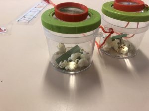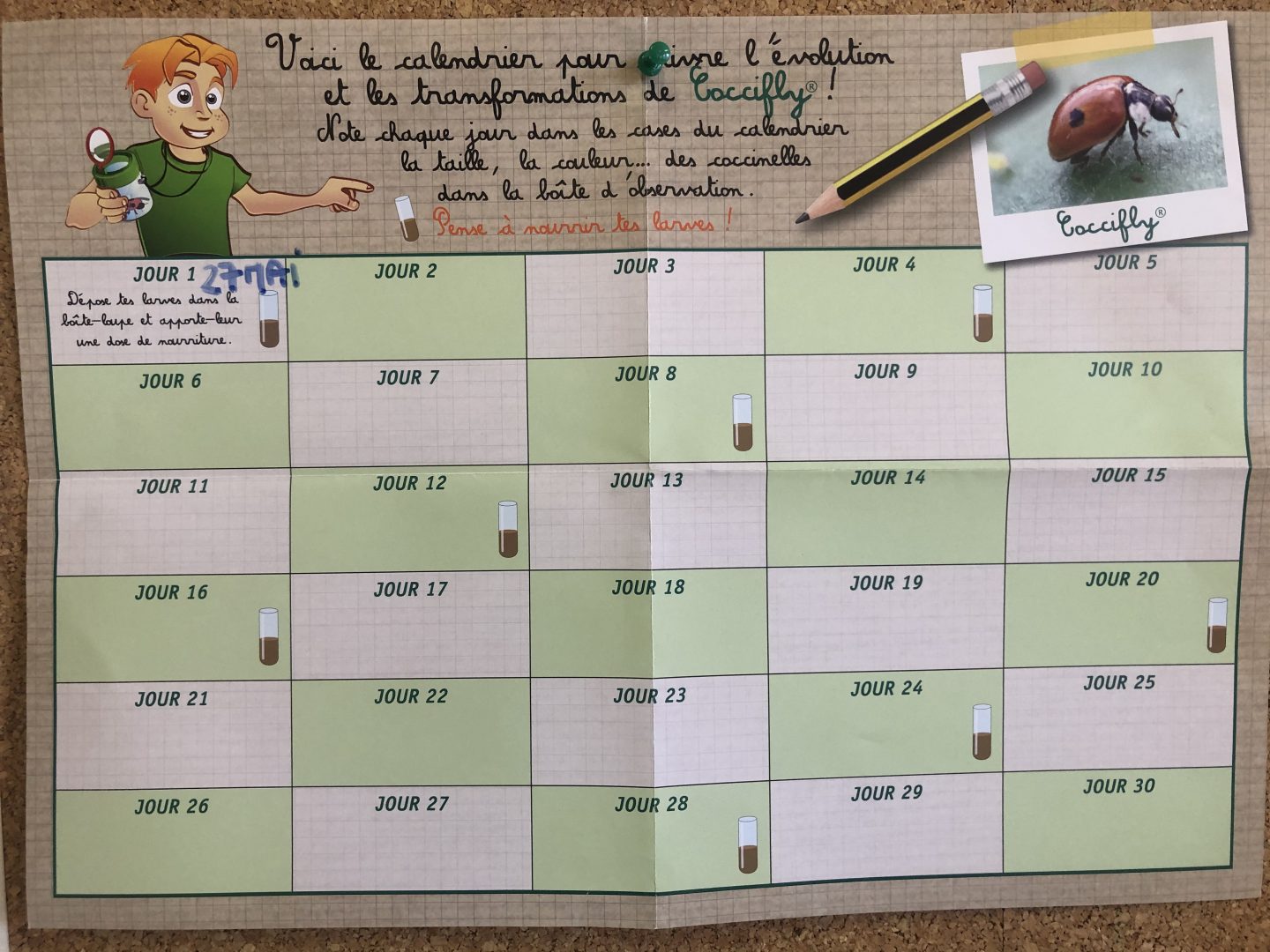 Un petit élevage à l’école : la coccifly , catégorie de coccinelles à 2 points. Nous avons reçu un kit d’élevage de coccinelles. Aujourd’hui nous avons placé les larves dans le flacon loupe avec de la nourriture. Nous allons observé l’évolution des larves … Dans 28 jours peut être aurons nous de belles coccinelles à 2 points ? La classe de Maîtresse Sabine fait aussi un élevage de coccinelles .