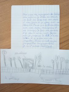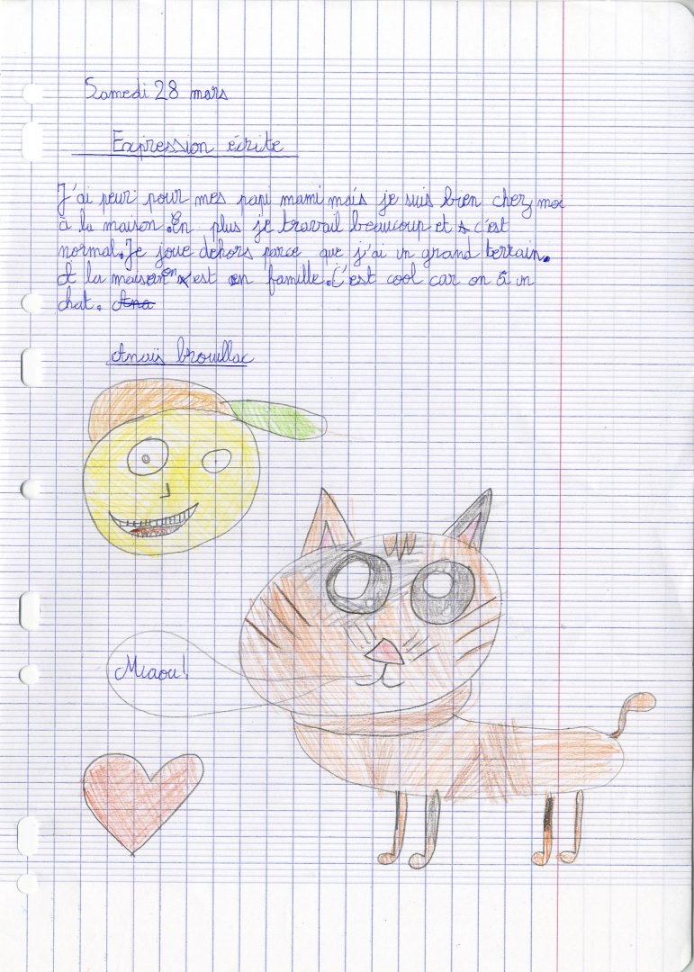Au bout de 15 jours de confinement les élèves ont fait des textes, des dessins, des photos pour expliquer comment ils vivaient leur confinement et exprimer leurs sentiments. Voici quelques productions: