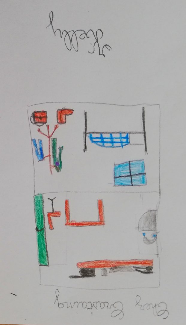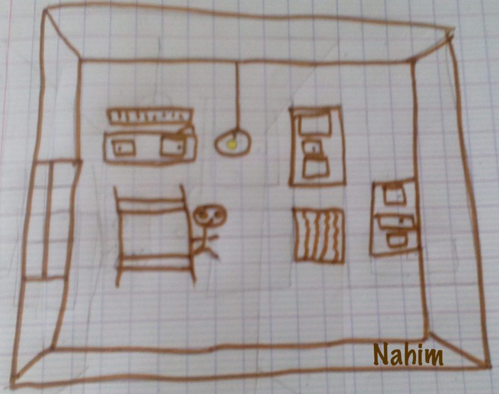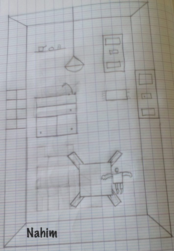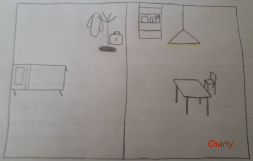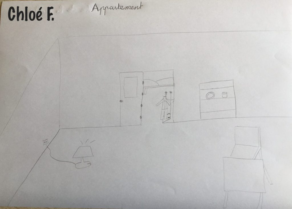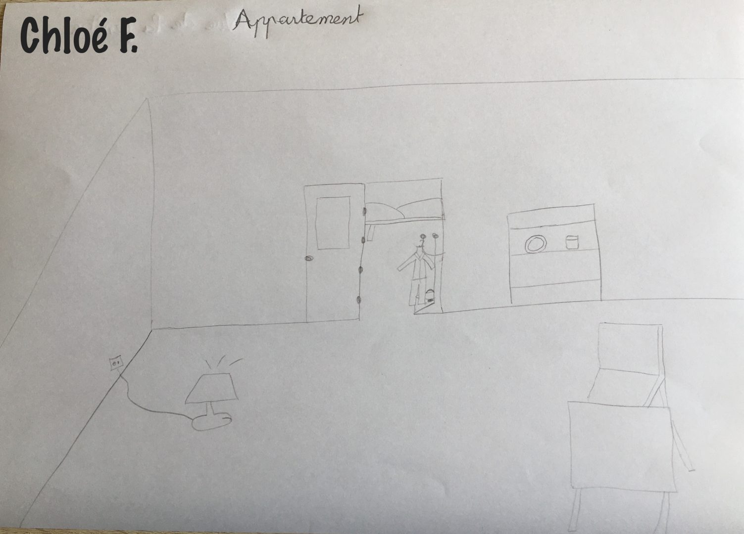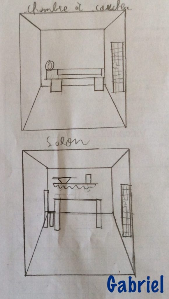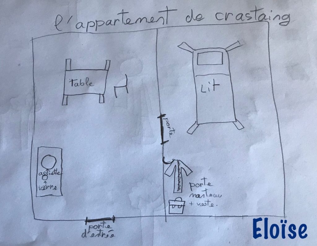 Premier dessin, et premier passage : celui décrivant l’appartement de Crastaing, un professeur de français (sont soulignés les éléments que j’attendais de voir sur le dessin) :