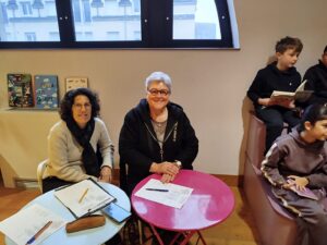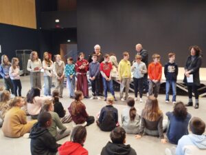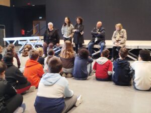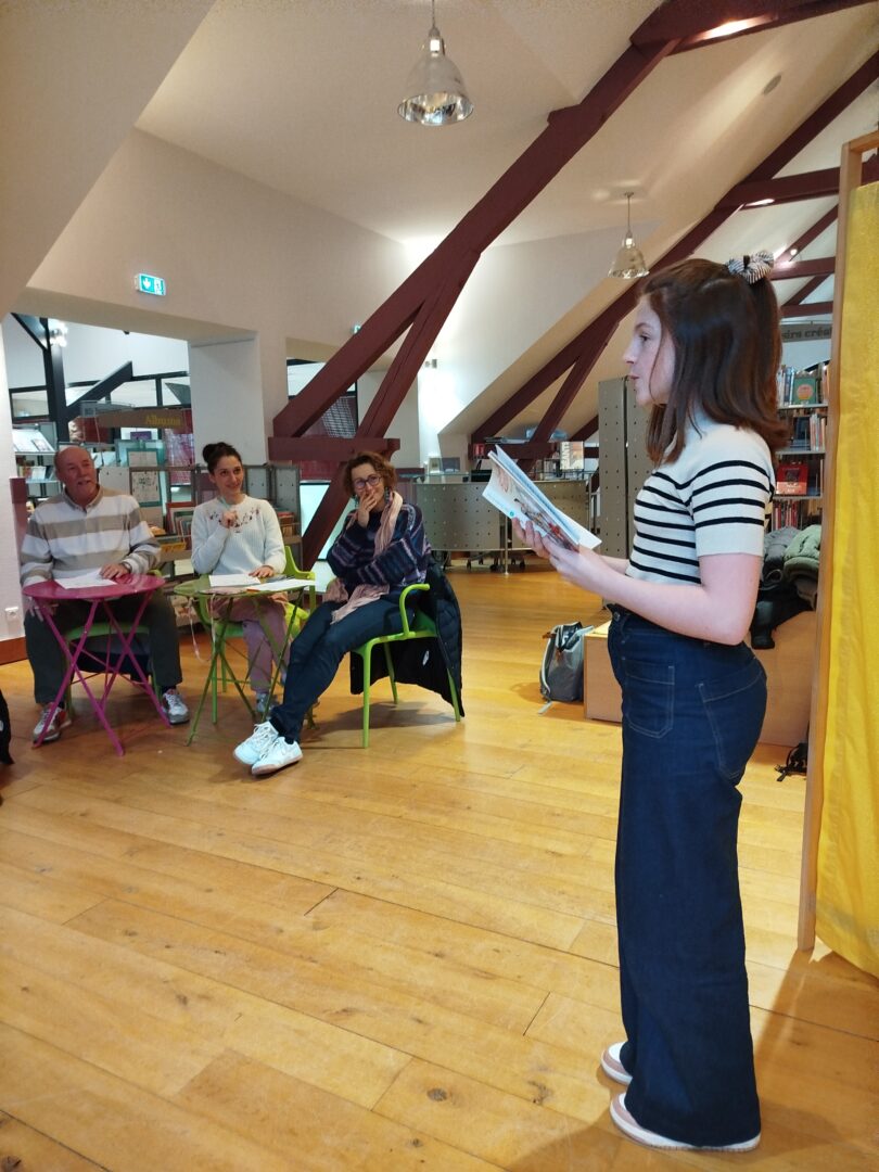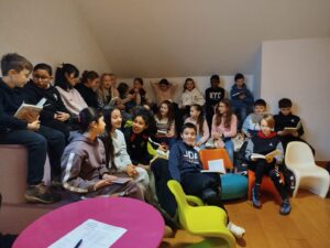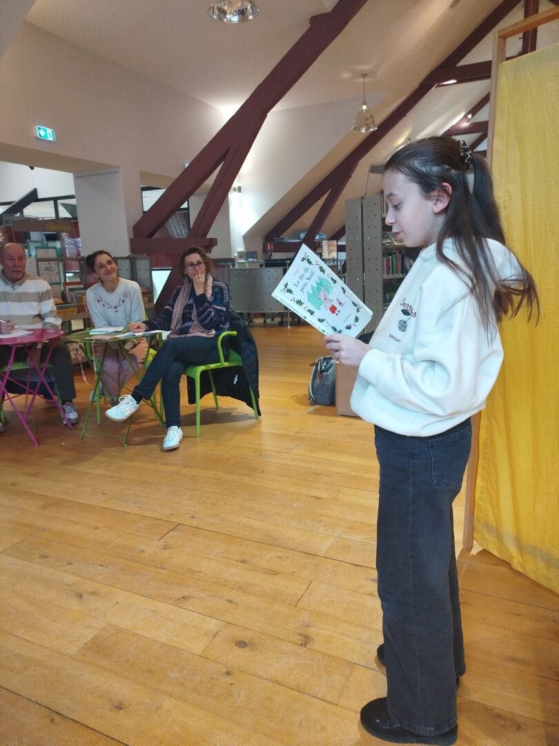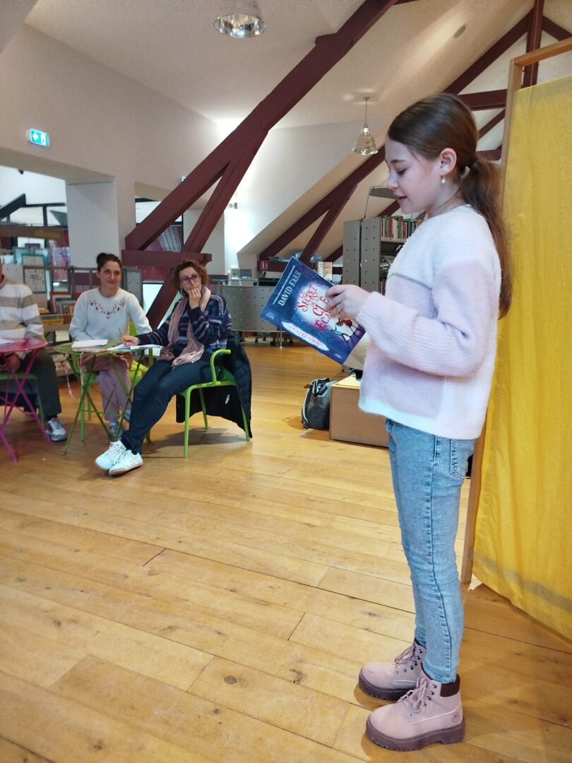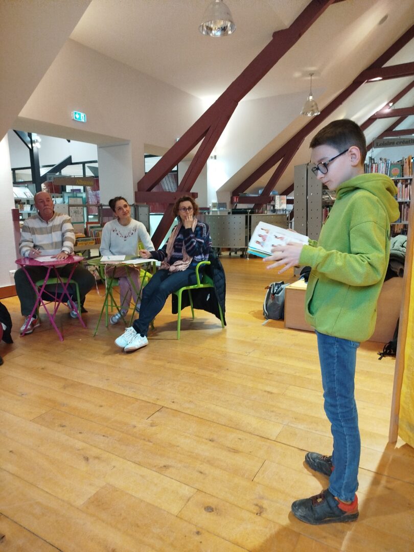 Puis est venu le temps d’organiser la finale école. Nous avons constitué un vrai jury, qui s’est rendu disponible pour deux matinées complètes, d’abord le mardi 13 janvier pour les CM1-CM2 et le mardi 20 janvier pour les CM2. Un grand merci à tous les cinq : Mme Le Gorrec, Mme Hurter, Mme Saulnier, M. Nicollin, et Mme Barsanti de la Médiathèque de Saint-Vit, où les classes ont été très bien accueillies, avec petit goûter et des rafraichissements pendant la pause !