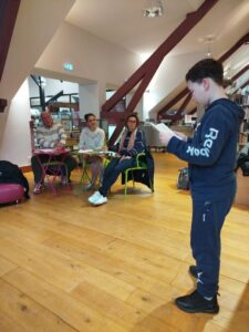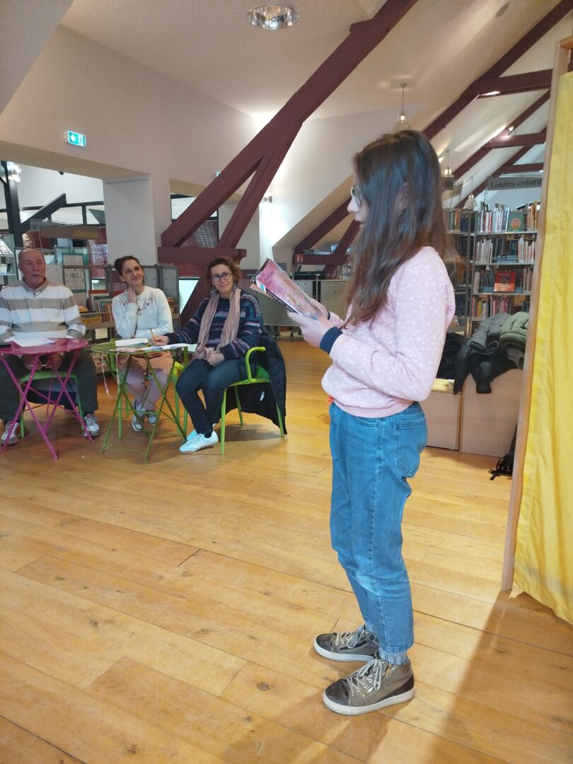 Dans un second temps, il faut accepter de faire sa prestation : parler assez fort, articuler, ne pas buter sur les mots, respecter la ponctuation, lever les yeux régulièrement vers le public, ne pas se cacher derrière son livre, ne pas se balancer d’un pied sur l’autre…et bien sûr, exprimer des émotions, mettre le ton, rendre sa lecture intéressante…!