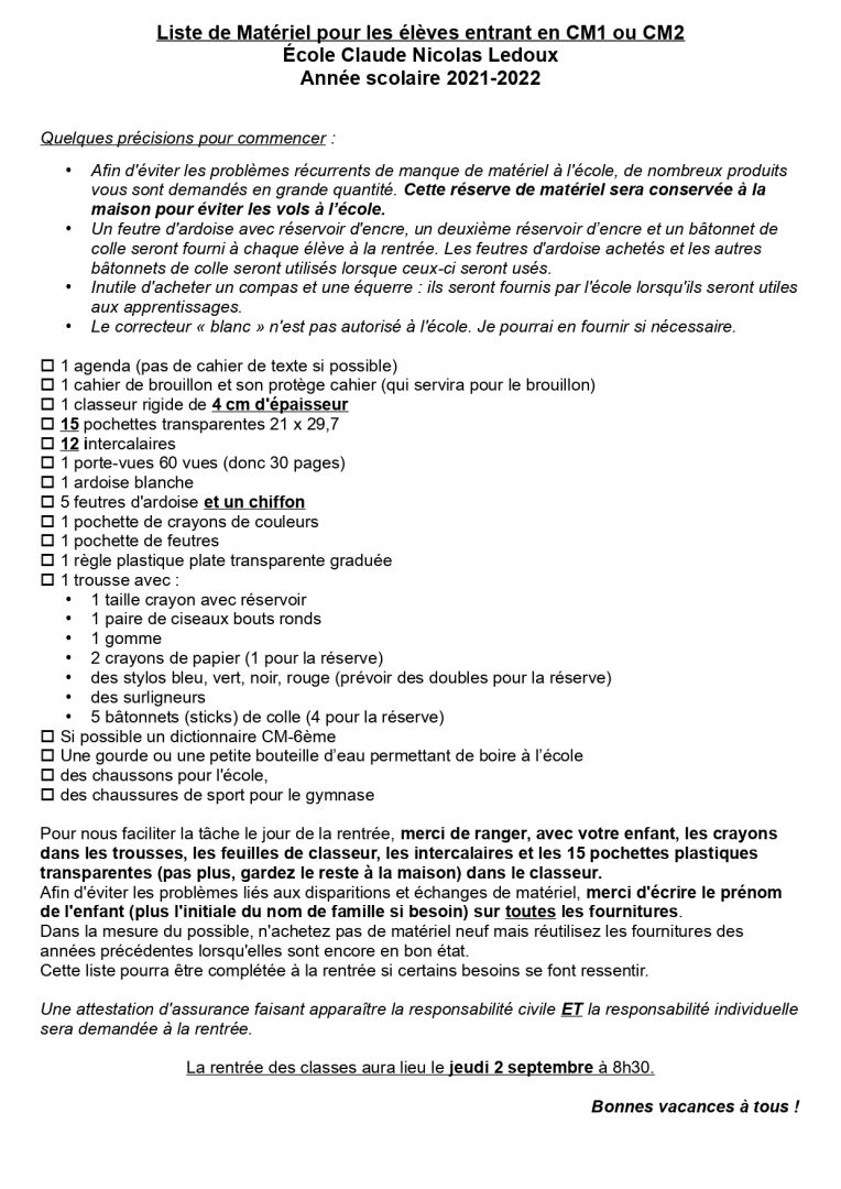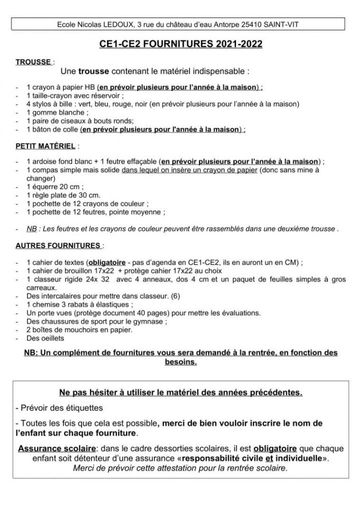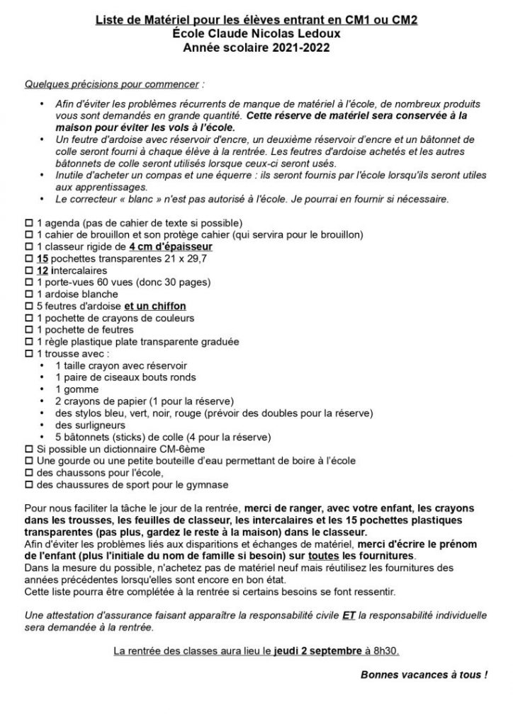 Vous trouverez ci-dessous et en pièces jointes les listes de fournitures scolaires pour la rentrée de septembre 2021.