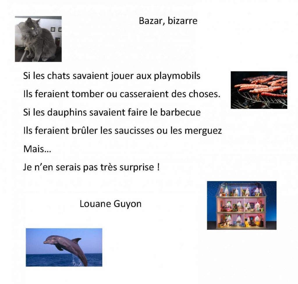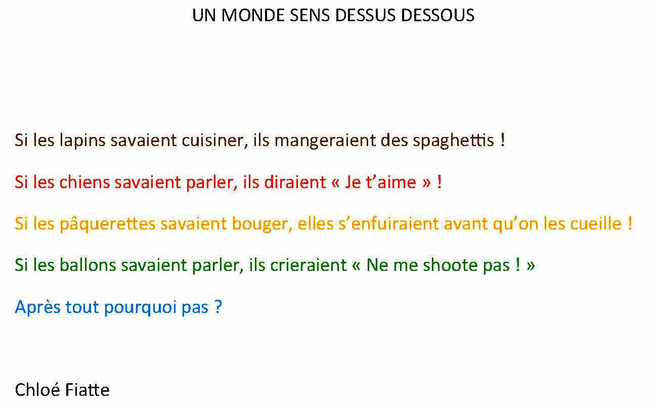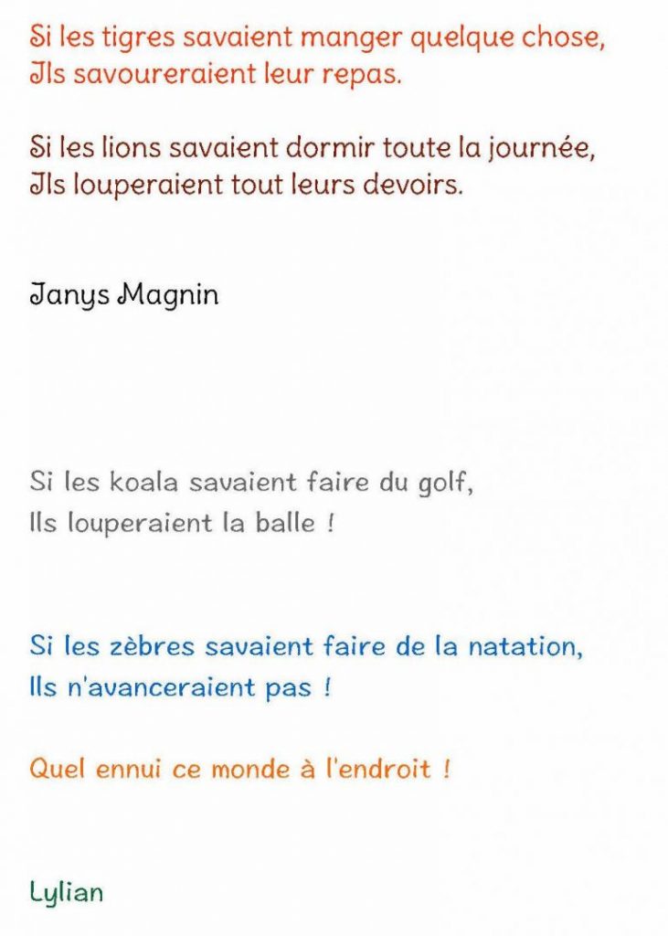 Pour le printemps des poètes (désormais terminé, mais bon … mieux vaut tard que jamais …), les CM1-CM2 ont créé leur propre poème en suivant un modèle et des consignes précises. Voici le résultat. Un grand bravo à tous pour votre imagination, votre créativité et votre humour !
