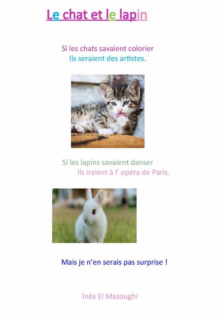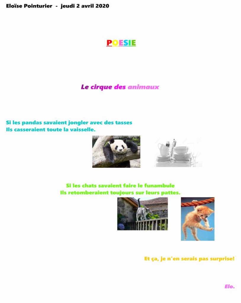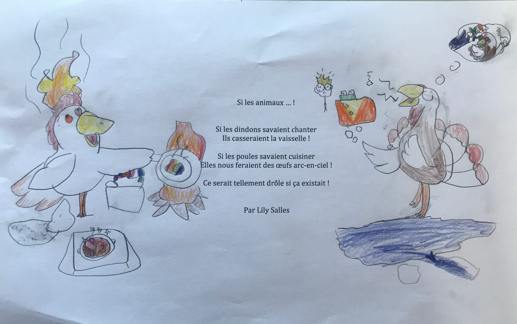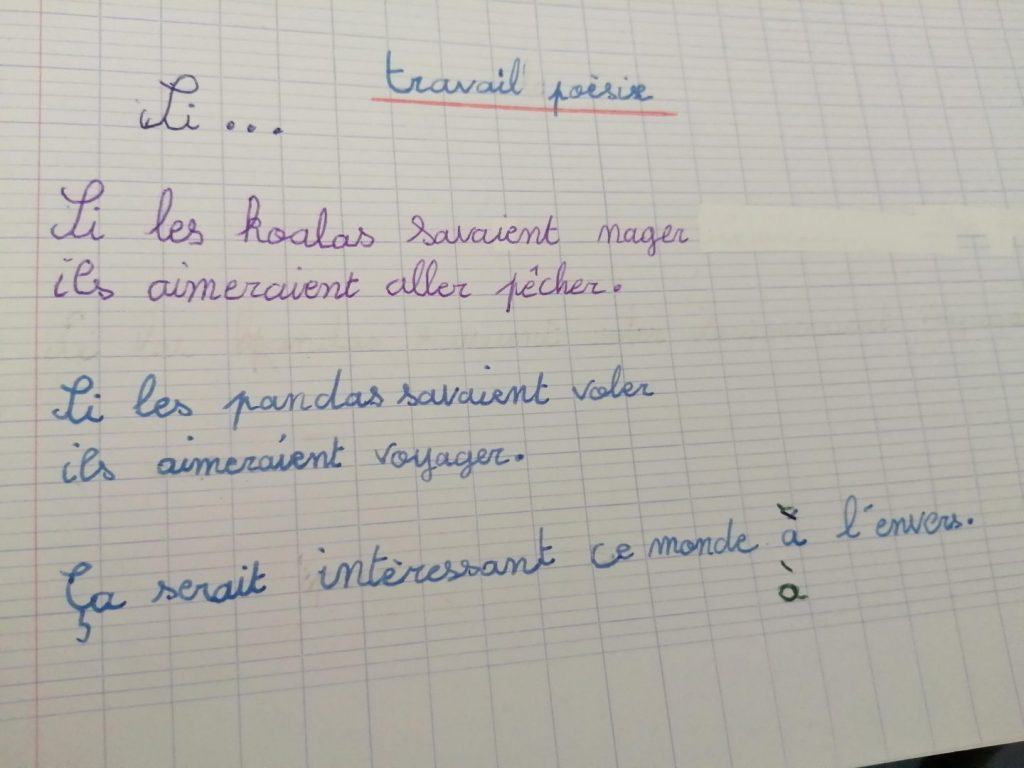 Pour le printemps des poètes (désormais terminé, mais bon … mieux vaut tard que jamais …), les CM1-CM2 ont créé leur propre poème en suivant un modèle et des consignes précises. Voici le résultat. Un grand bravo à tous pour votre imagination, votre créativité et votre humour !