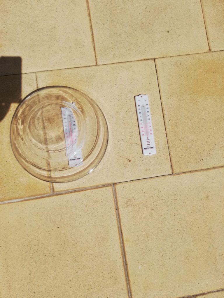 Prends 2 thermomètres. Vérifie qu’ils indiquent la même température lorsqu’ils sont au même endroit pendant quelques minutes. Pose-les par terre au soleil, à 20 cm environ l’un de l’autre, et recouvre l’un des deux thermomètres d’un saladier transparent.