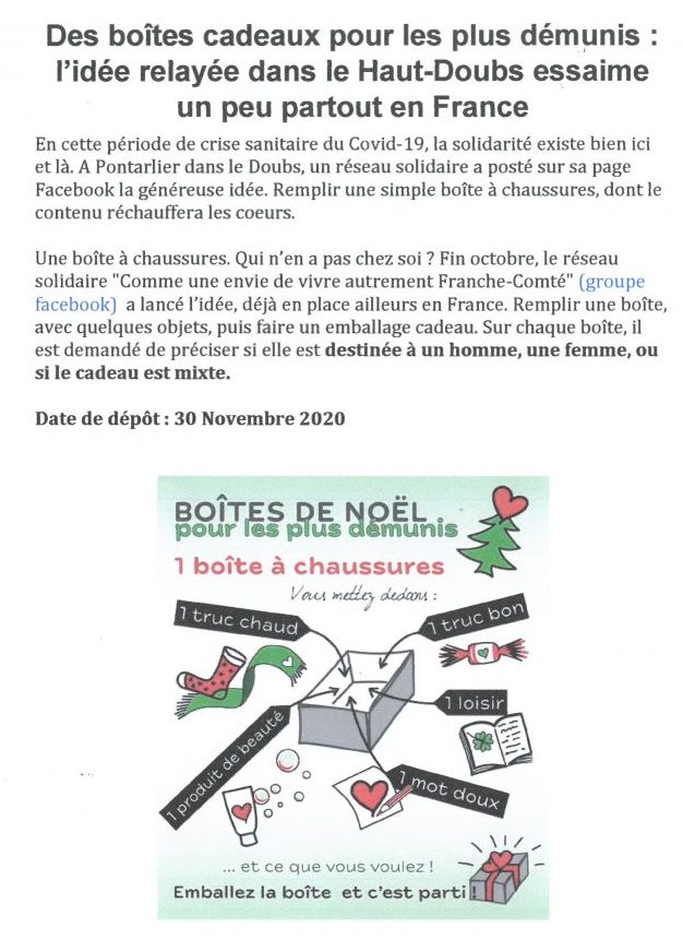 Au mois de novembre, une élève de l’école nous a proposé de participer à l’opération « Une boite pour les plus démunis », en remplissant des boites à chaussures avec