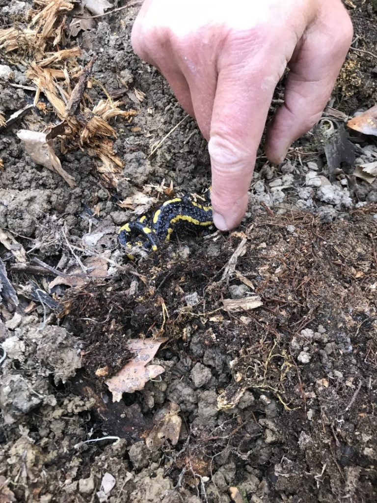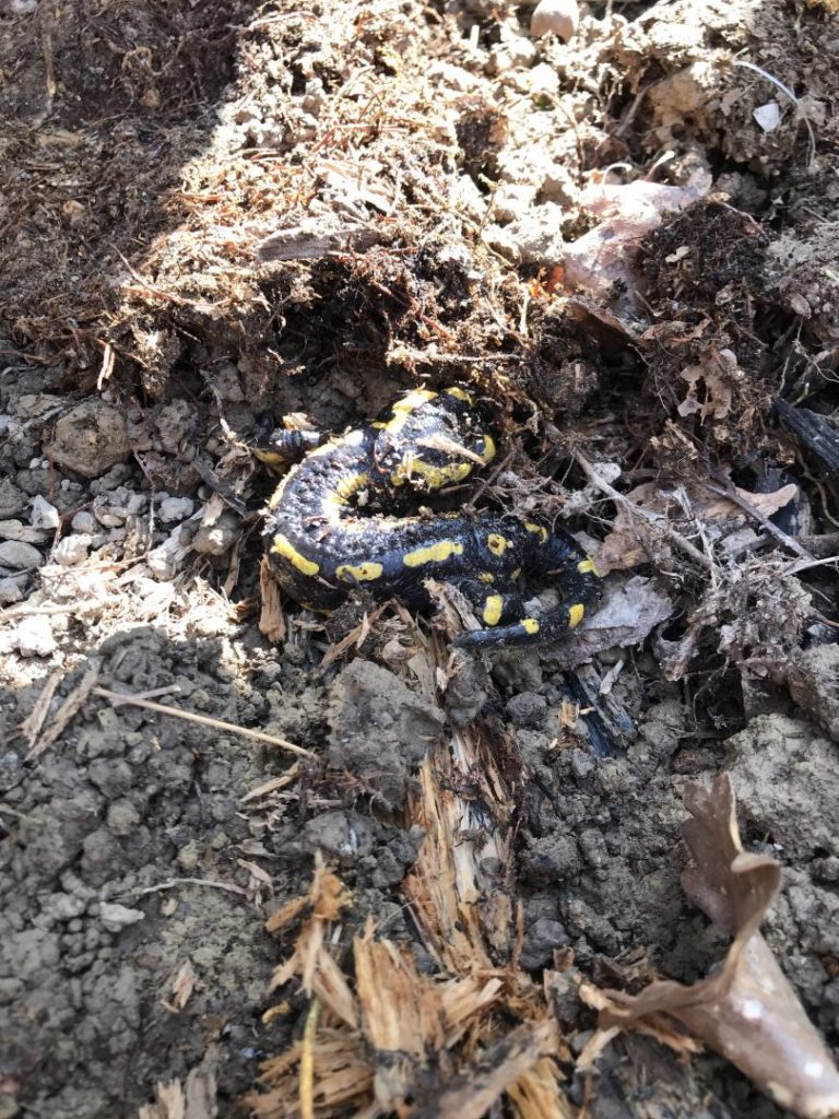 Et … une salamandre en train de dormir sous une souche ! Les salamandres sont des batraciens vivant sur terre, et qui ne sortent que la nuit (ils sont donc nocturnes) et si possible lorsqu’il fait humide.